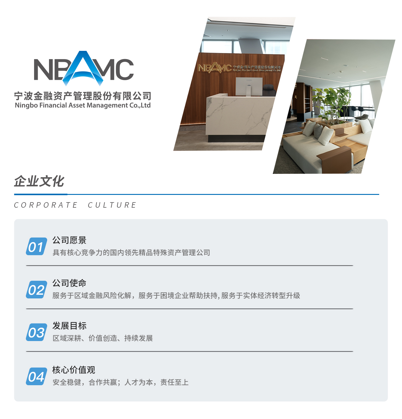寧波金融資產管理股份有限公司(簡稱“公司”)是經寧波市人民政府批準設立,由中國銀監會核準公告,開展轄內金融企業不良資產批量收購處置業務的地方資產管理公司。公司成立于2017年2月,注冊資本金10億元,股東為寧波市金融控股有限公司、寧波開發投資集團有限公司、昆侖信托有限責任公司。公司實行市場化體制機制。